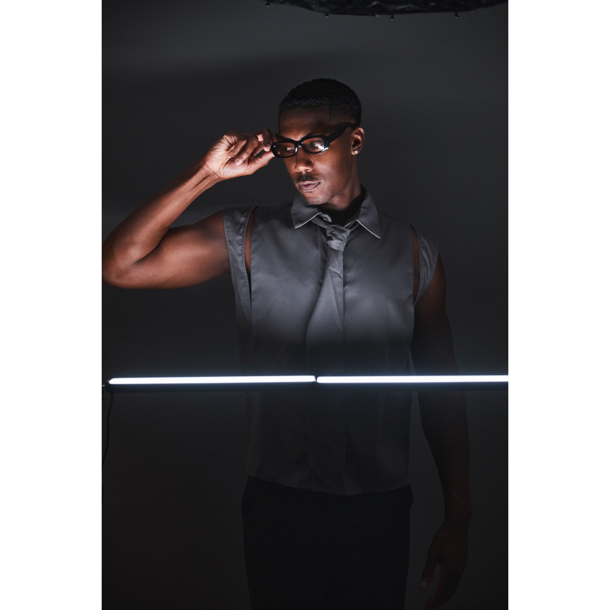 Gray sleeveless button top with removable tie. Model wearing Large.