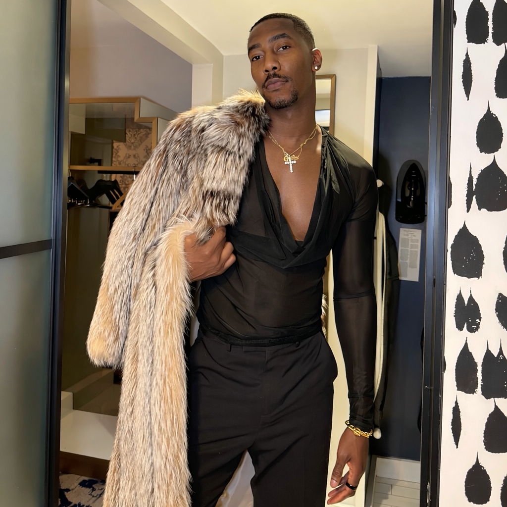 Black mesh long sleeve top with draping neck. Model wearing L. Fits true to size.