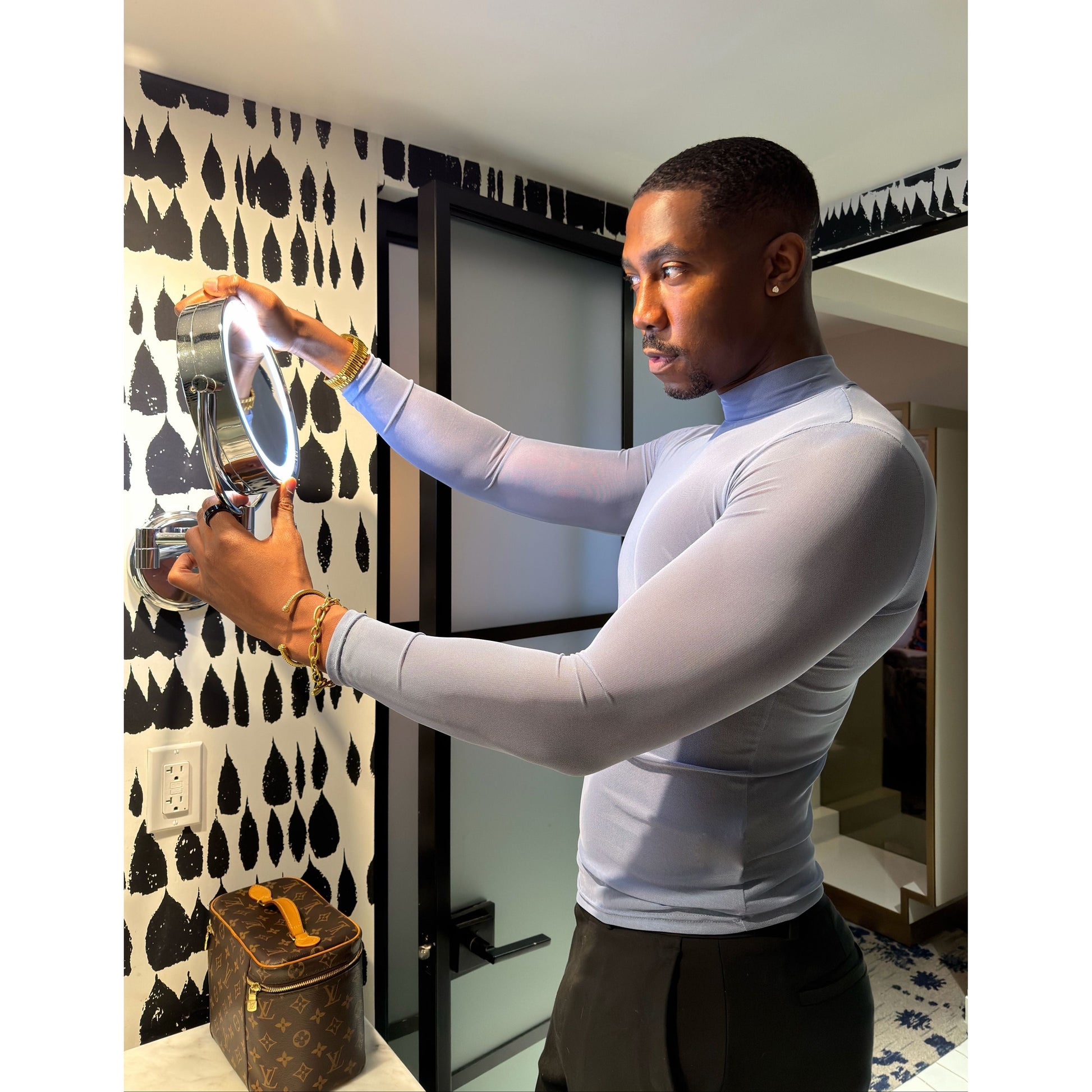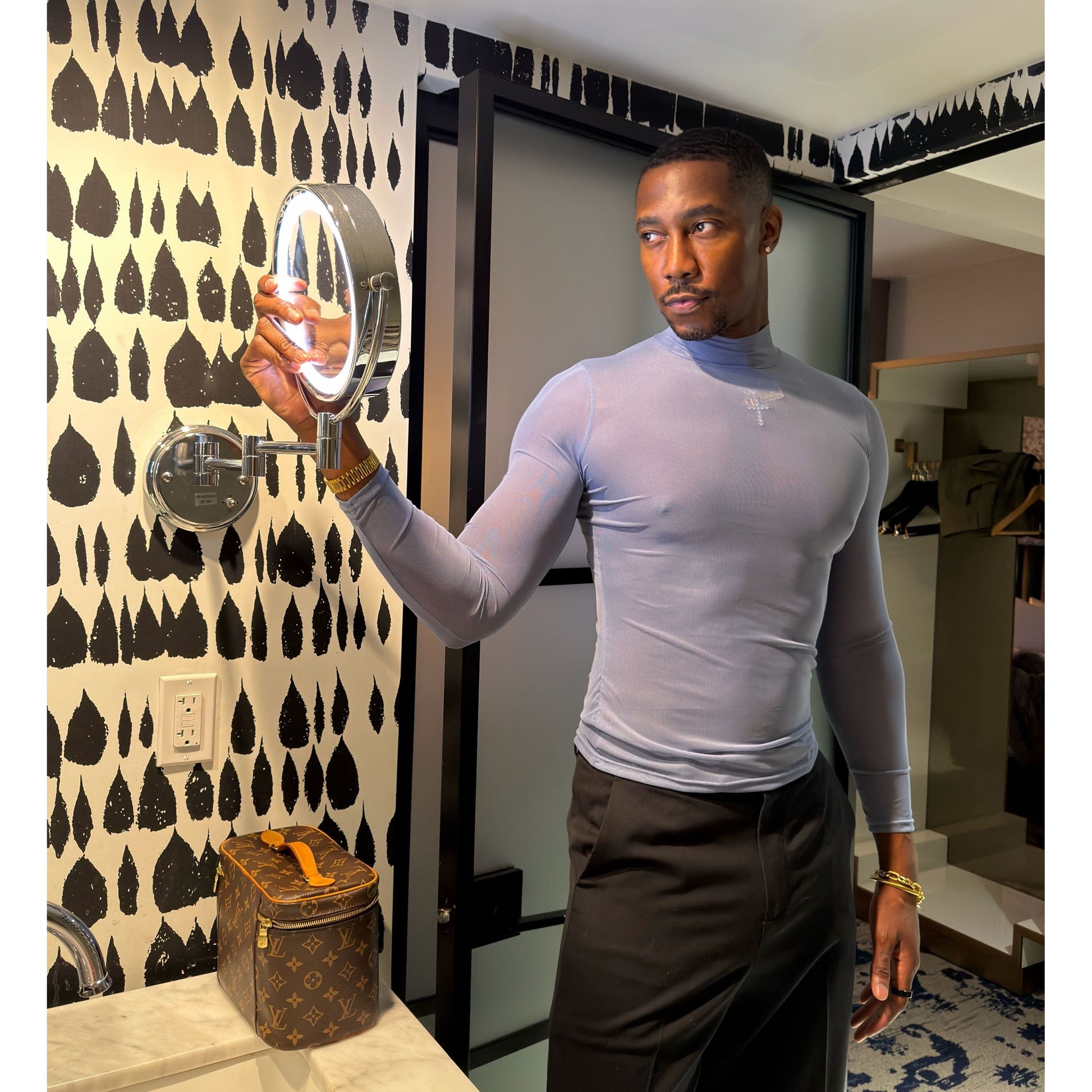 Light Blue mesh long sleeve top. Model wearing L. Size down for a tight fit.